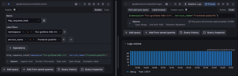 Manual correlation is the simplest to understand. If you have a set of metrics you are looking at you just take the labels and run a search for logs using the logs equivalent labels over the same period of time. Bam, you have your logs. Bonus points if you use the “split” feature in explore so you can simultaneously look at your metrics and the logs you correlated. This can also be done from logs to metrics, traces to logs, whatever way you want it.