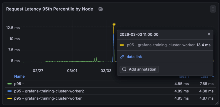 Each of these methods of correlating data has its place in Grafana and a good observability set up can take advantage of all 3. Data source wide correlations for data you regularly need to jump between, data links for guiding through a dashboard whilst maintaining context and then for when you have a more niche problem you are troubleshooting manually looking for corresponding telemetry.
