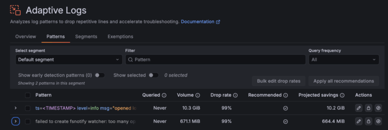 Getting adaptive telemetry to work is just a question of creating a good set of rules, luckily the brains at Grafana have made it a good bit easier to get started. When you go into the adaptive telemetry menu (split into metrics, logs and traces) you will find a set of recommended rules generated by Grafana based on your current usage of metrics, logs and traces.